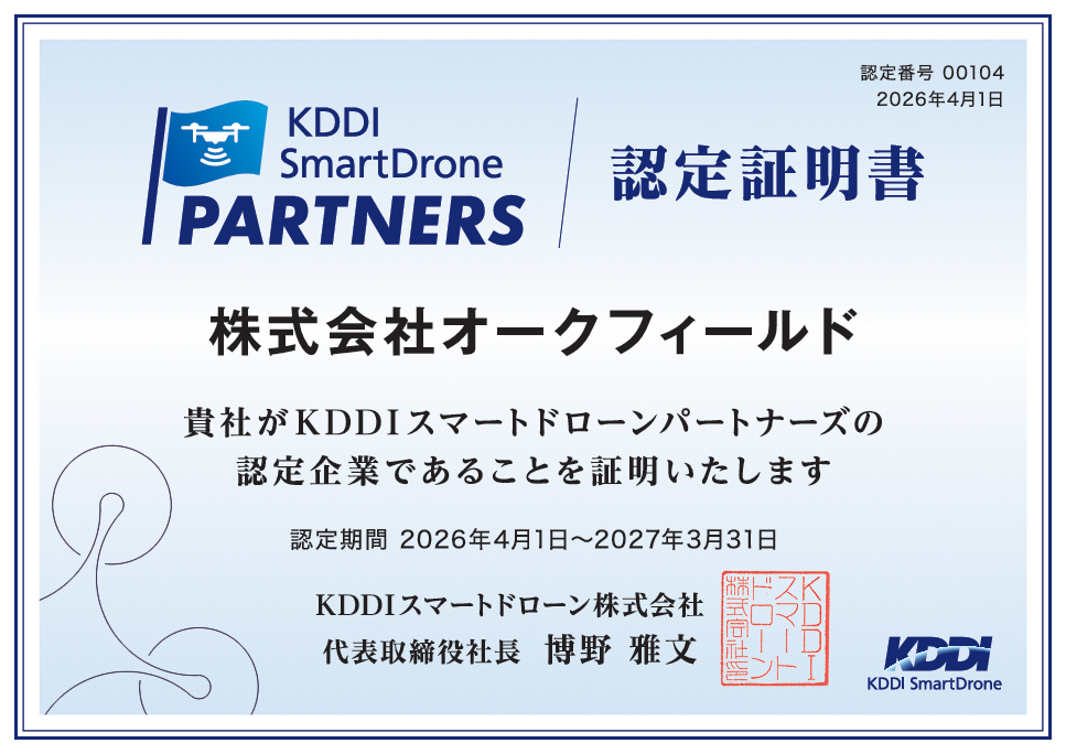 株式会社オークフィールドは、KDDIスマートドローン株式会社が提供する販売代理店として、ドローンソリューションの普及・推進に取り組んでおります。